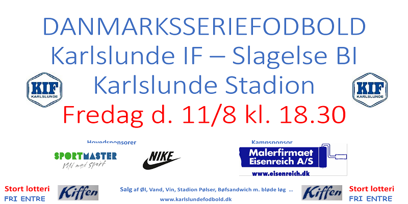 Så er der igen underholdning på Karlslunde Stadion. Det gælder sæsonens første hjemmekamp mod Slagelse B&I. Slagelse kommer fra Sjællandsseriens pulje 2, hvor de vandt med 58 point (12 hold). Karlslunde var i dag (lørdag) på udebane mod Stenløse BK men måtte desværre tage hjem med et nederlag på 1-0. Det var ellers en god debut og der blev vist gode takter, så næste slag på hjemmebane skal nok give point. Slagelse åbner i morgen søndag d. 6. august mod LSF (Ledøje-Smørum Fodbold), som endte på 2. pladsen i pulje 2, hvor Karlslunde endte på 8. pladsen.