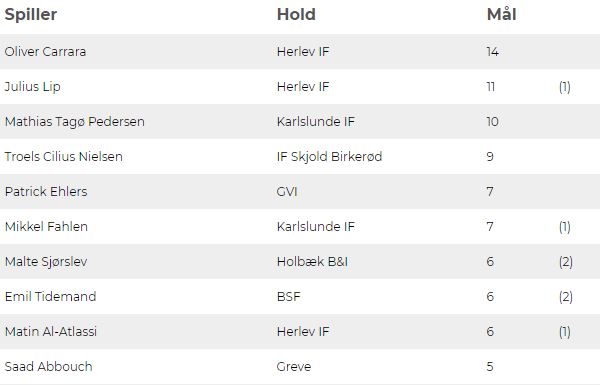 Karlslunde er et af de mest scorende hold i Danmarksserien og det ses også på topscorelisten, hvor KIF har 2 mand med på top 10. Listen ser således ud: