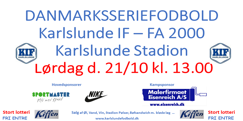 Denne gang kommer FA 200 fra Frederiksberg på besøg. Seneste møde på deres hjemmebane endte 1-1 og FA 2000 ligger nummer 6 i rækken med 16 point. Karlslunde ligger, efter Fredensborgs overraskende sejr i Holbæk, nummer 9 med 9 point, så det vil lune med 3 point på kontoen. Stadion vil som sædvanligt være bemandet med A-kæden fra FC Kiffen, så kom glad og vær med til at heppe holdet frem. Der vil være salg af øl, vand, vin, pølser og lodder til det store lotteri og som tidligere er det GRATIS at komme ind.