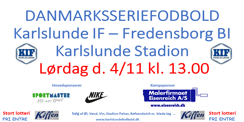 Så er det sidste chance for at se Karlslundes Danmarksseriehold på hjemmebane i år. Denne gang er det Fredensborg der kommer på besøg og det skulle gerne ende med 3 point til Karlslunde. Ved det seneste møde i Fredensborg vandt Karlslunde 2-0 og med ubesejret i de 2 seneste hjemmekampe må Karlslunde være favorit til at gå fra banen med en sejr og alle 3 point. I sidste weekend var holdet en tur i Kastrup. Det blev desværre ikke til point, vi tabte 5-2, og da de øvrige resultater heller ikke faldt ud til Karlslundes fordel, ligger holdet nu på sidstepladsen a point med Taastrup FC. 3 point på lørdag og lidt held med de øvrige resultatter, så vil Karlslunde overvintre over stregen. DMI lover høj sol og 20 graders varme, så kom på stadion og oplev en god fodboldkamp og en god stemning. Der vil, som altid, være salg af øl, vand, vin, pølser og lodder til det store lotteri og det er selvfølgelig GRATIS at komme ind. Pga den 'fantastiske' sommer og det 'varme' efterår spilles kampen på kunstgræsbanen. Velmødt til alle.